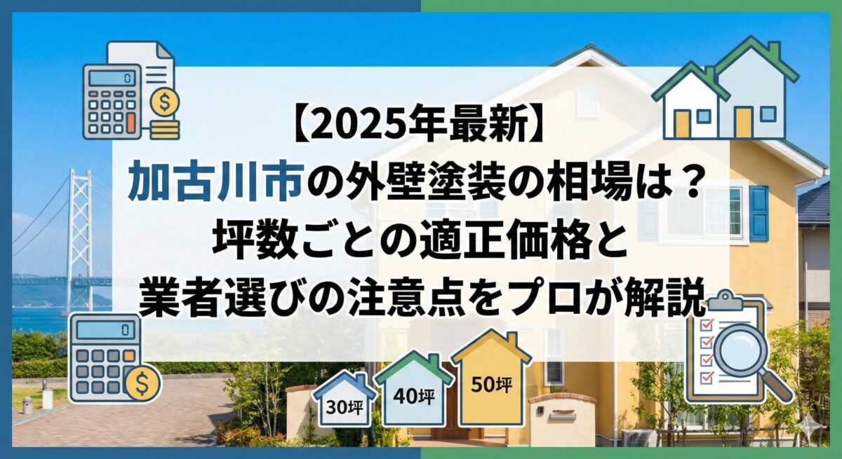 加古川市における外壁塗装の相場は、30坪で80〜110万円程度、40坪で100〜140万円程度(屋根セットの場合)が2025年現在の目安です。
